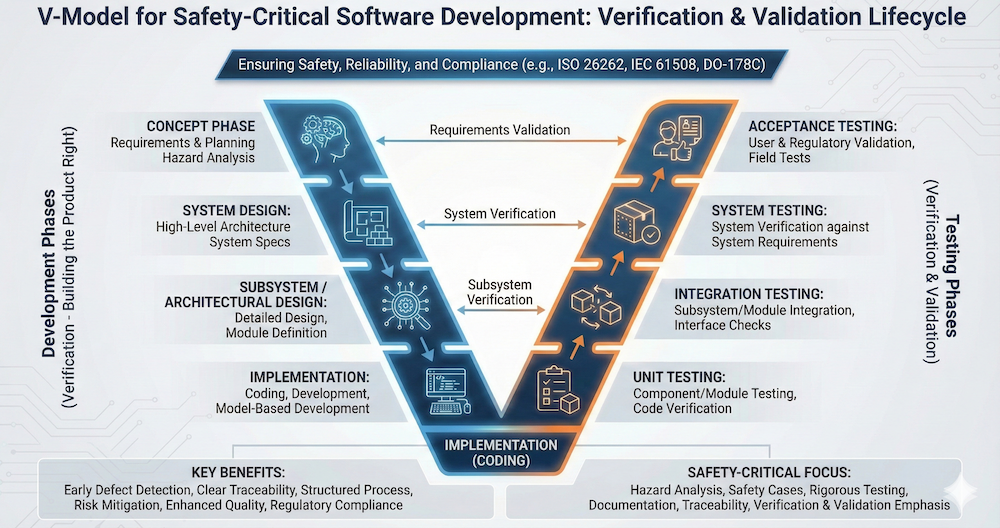 The traditional approach to safety-critical software development is a highly manual, labor-intensive process often guided by the so-called “V-Model”. The V-Model is a structured approach to software development, often mandated in safety-critical contexts, that emphasizes verification and validation throughout the entire life cycle:
