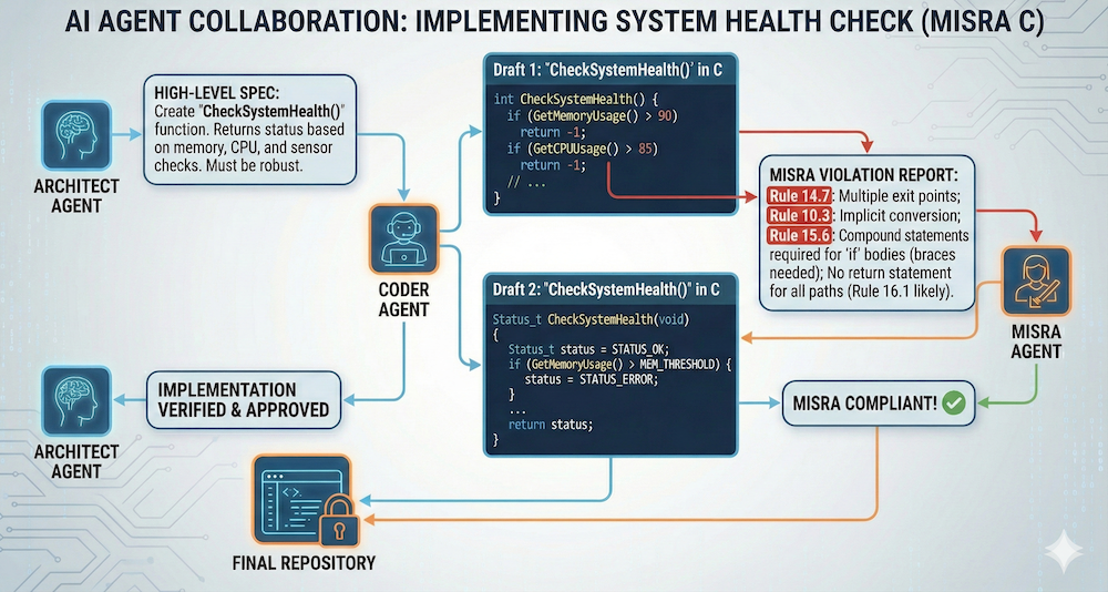 At each step of the V, multiple agents collaborate to produce the necessary artifacts. For example, to translate low-level requirements into code, an Architect Agent might collaborate – and sometimes even have a full on debate! – with a Coder Agent as well as a MISRA Agent to ensure that the code not only satisfies the parameters of the system architecture but also strict MISRA coding rules. In one project, a total of 17 different agents were used to produce IEC 62304-compliant artifacts, where each agent was carefully instructed to comply with a different aspect of the IEC standard. This cohesive, automated workflow ensures that evidence generation is co-produced with the code, eliminating the months of manual effort typically spent on documentation and verification.